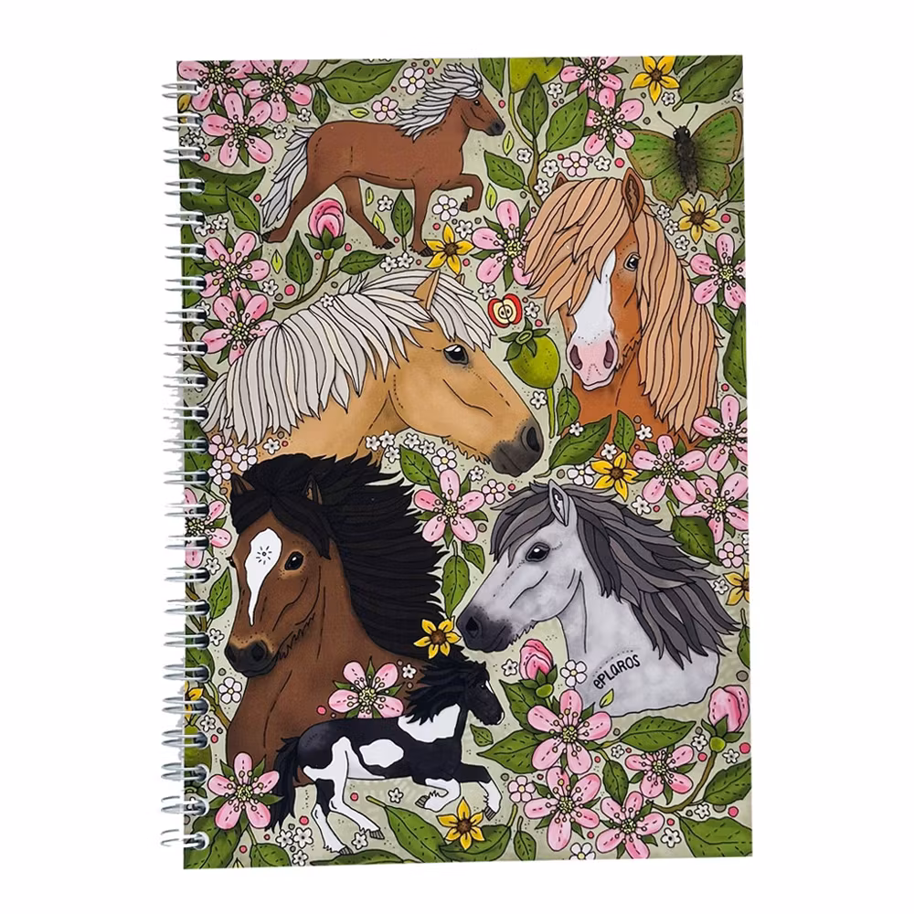 Spiralblock i A5-format. Detaljrik tecknad framsida med islandshästar och äppelblom. Blocket innehåller 50 st randiga sidor med motiv längst ner. Det härliga motivet följer med till insidan av pärmen. Anteckningsbokens baksida är utan tryck.